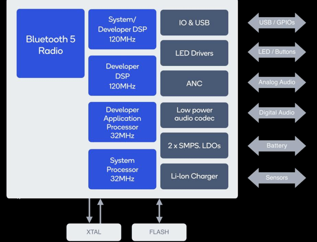Das System-on-Chip (SoC) QCC5124 von Qualcomm wurde entwickelt, um die Anforderungen kleiner Geräte an ein robustes, hochwertiges, drahtloses Bluetooth-Hörerlebnis mit geringem Stromverbrauch für eine längere Audiowiedergabe zu erfüllen. Die QCC5124-Architektur ist auf hohe Leistung bei geringem Stromverbrauch ausgelegt. Im Vergleich zur bisherigen Technologie kann der Stromverbrauch um bis zu 65% gesenkt werden, was eine längere Audiowiedergabe in fast allen Betriebsmodi ermöglicht.